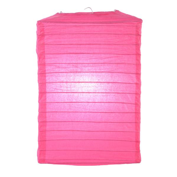 Fuchsia long box square paper lanterns. Lantern is held open with a wire expander. Lantern is beautiful with wire ribbings.