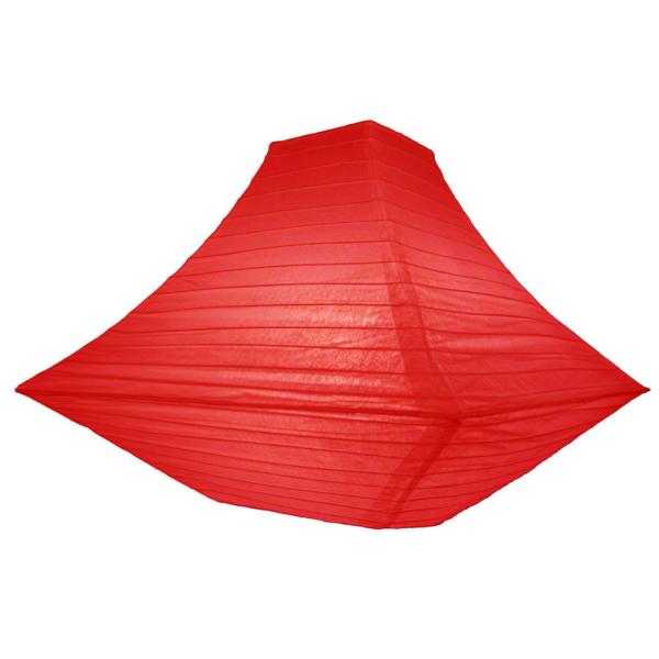 Red color paper lantern in a unique pagoda shape. Lantern is held open with a wire expander.
