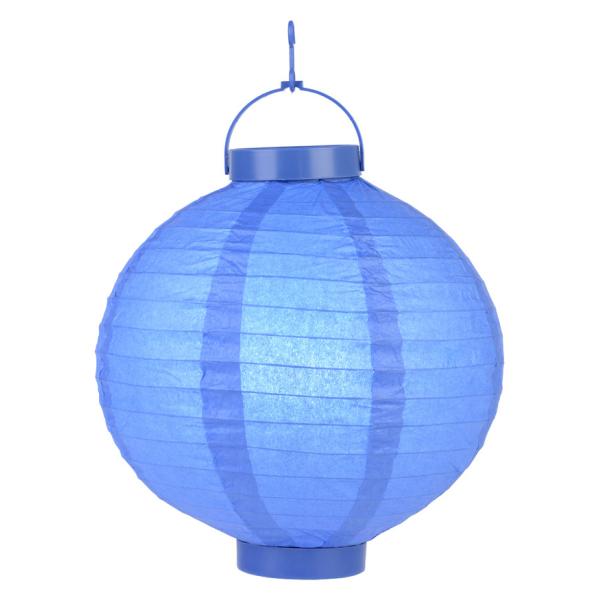 This 14" 16 LED dark blue round paper battery lantern is great for indoor or outdoor use. Hang this lantern from anywhere and illuminate with 3 AAA batteries. This lantern can either be hung or set on a table as a centerpiece. Use this lantern as the centerpiece for your wedding or hang it from trees or around the home. Batteries not included, lantern comes with 16 built in LED super efficient bulbs. This battery lantern will last over 8+ hours on one set of batteries. Lanterns come with a on/off switch. Comes with a plastic hook on top of the lantern for easy hanging.