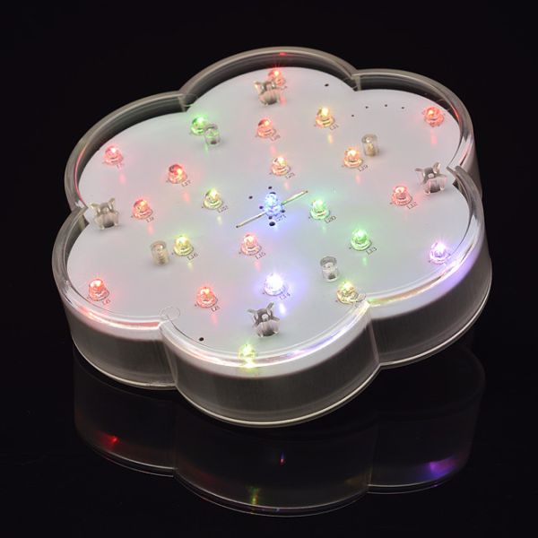 Our LED centerpiece vase light is designed to light up your floral arrangements. Place this light base at the bottom of your vases and turn these LED lights on, to make your vase arrangements glow. This RGB vase light will change colors every 3-5 seconds, color schemes range between red, green, and blues.